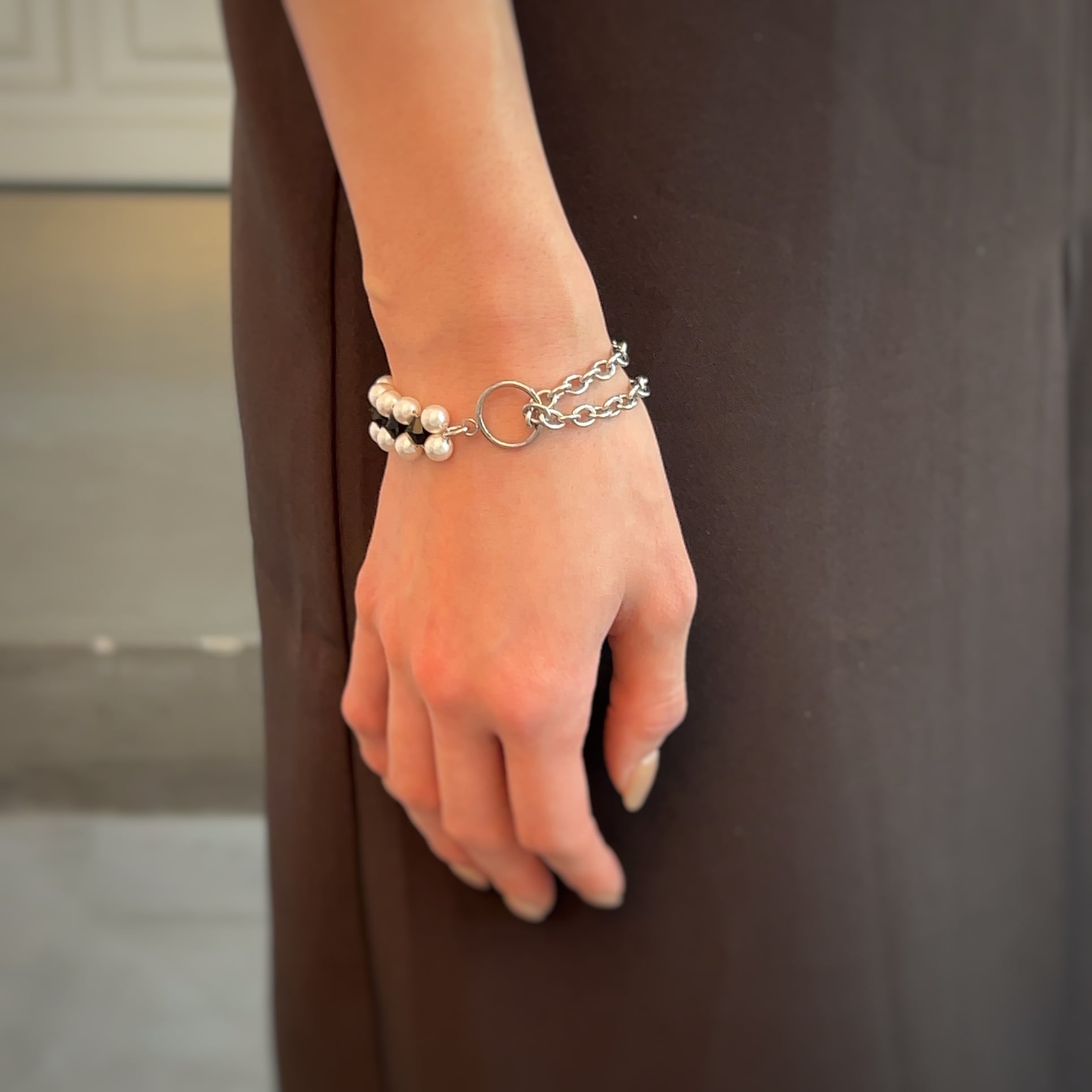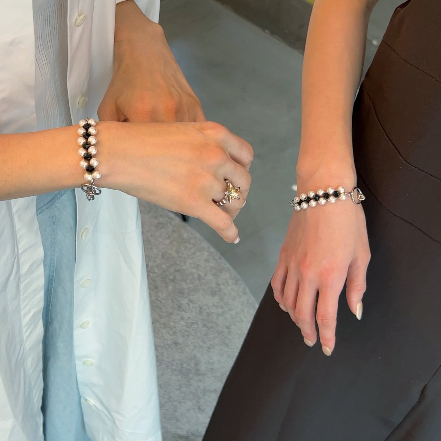 シルバーとブラックのコントラストが美しい、ミステリアスな雰囲気漂うブレスレット。