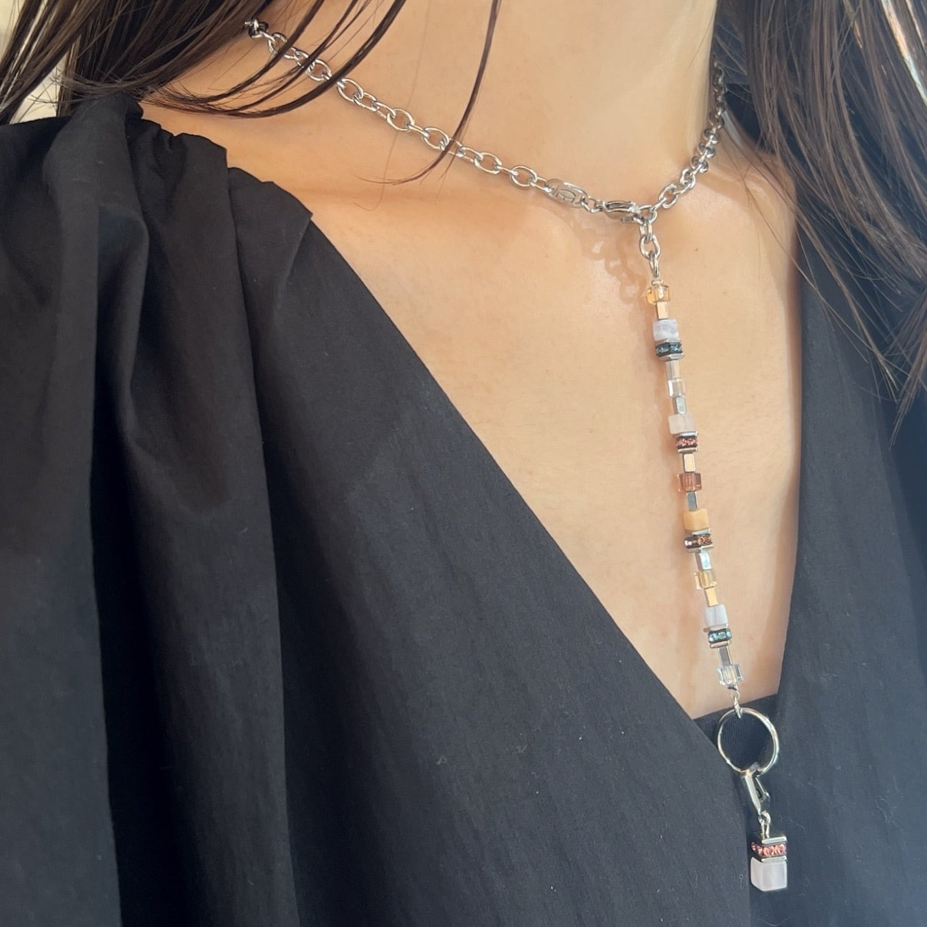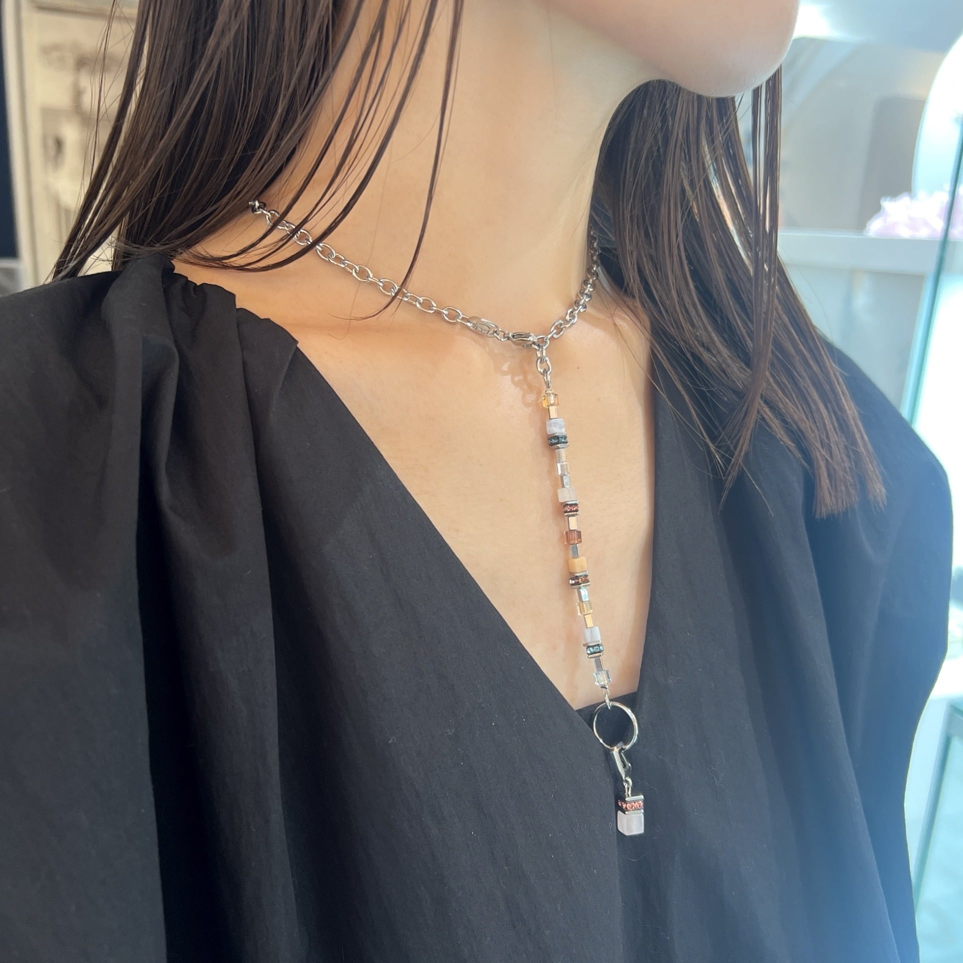 Swarovski®や天然石を使用したキューブ&チェーンネックレス。