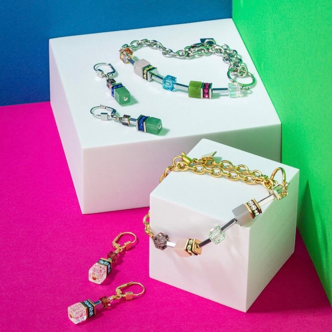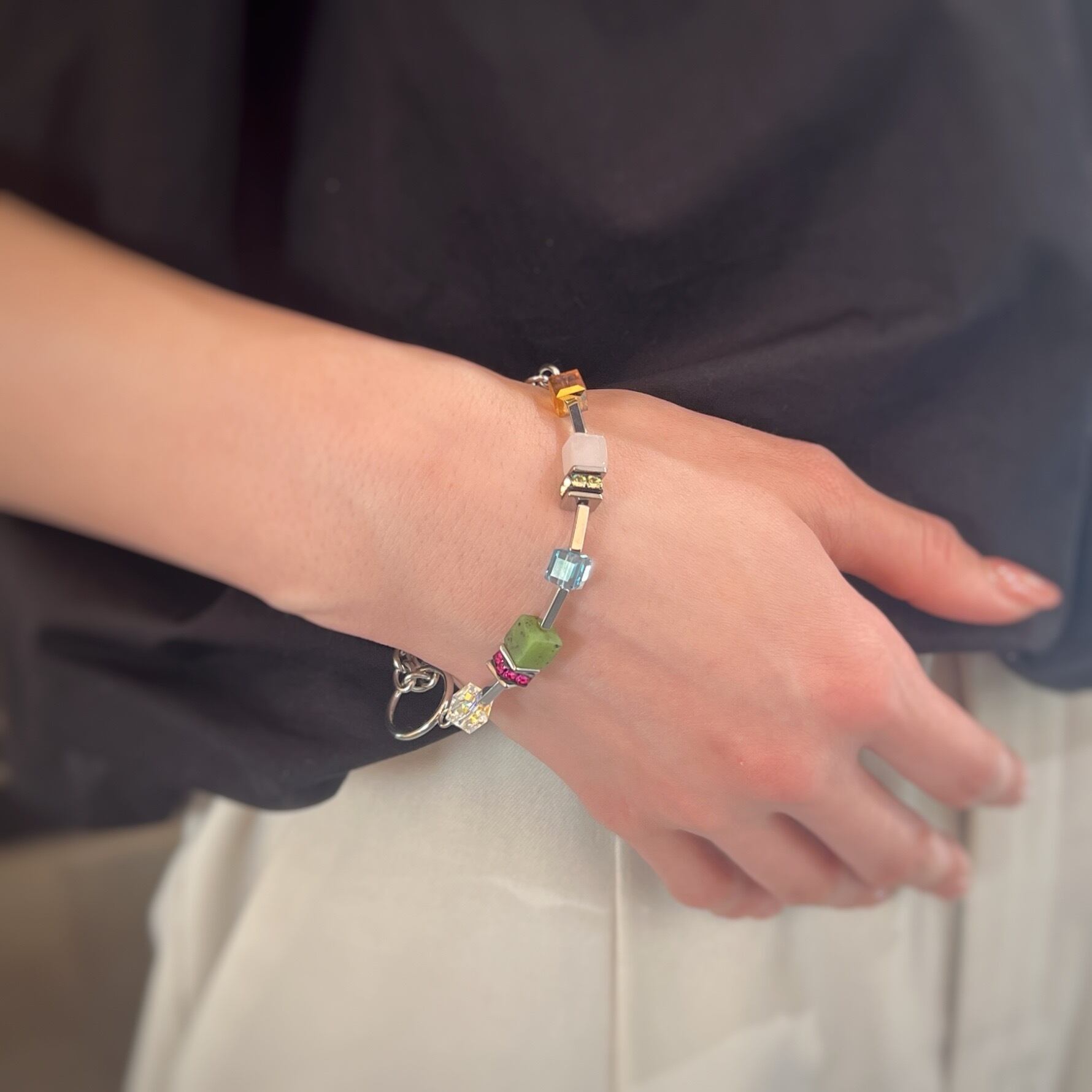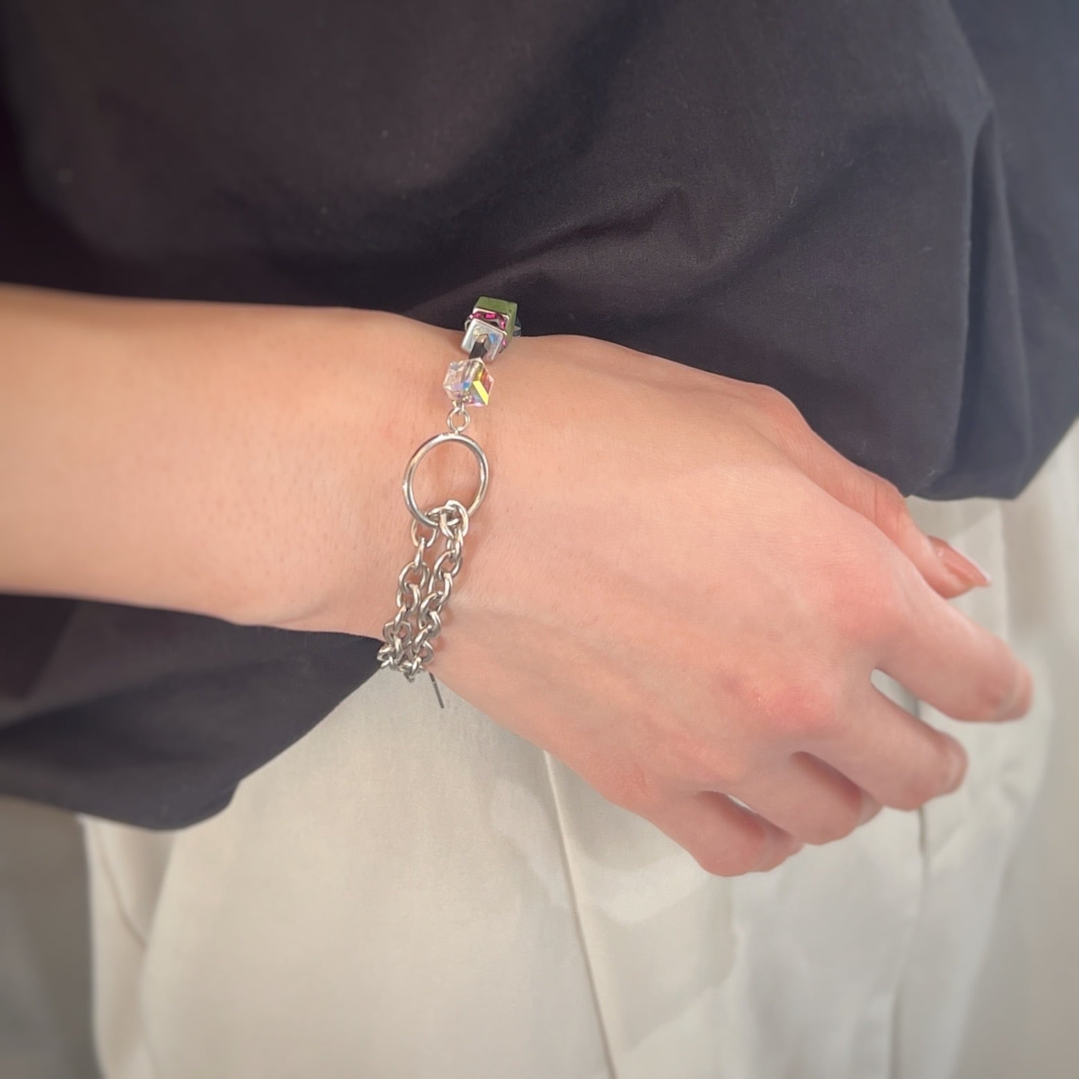 シルバーチェーンと美しいキューブ型のSwarovski® Crystalsや天然石を使用したブレスレット。