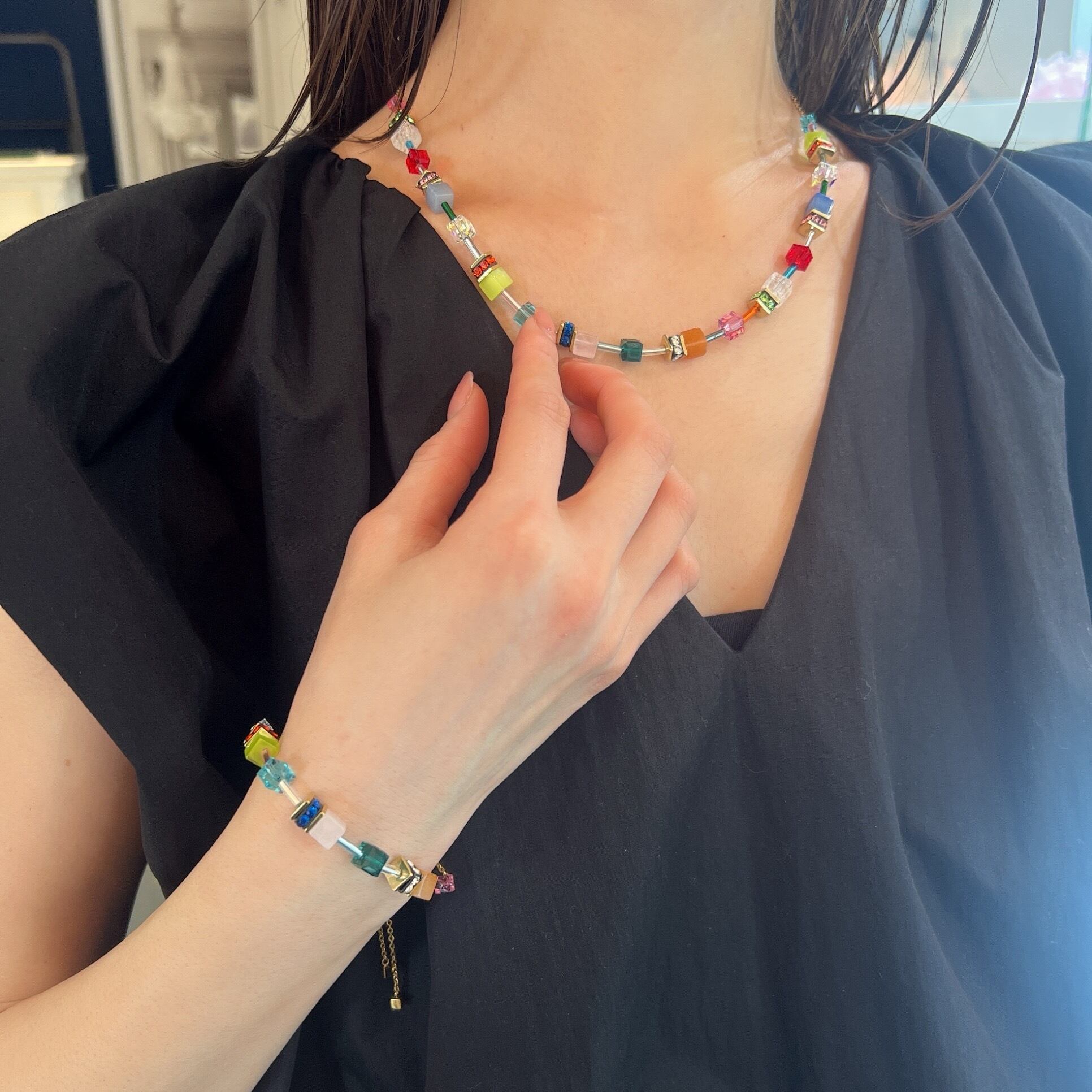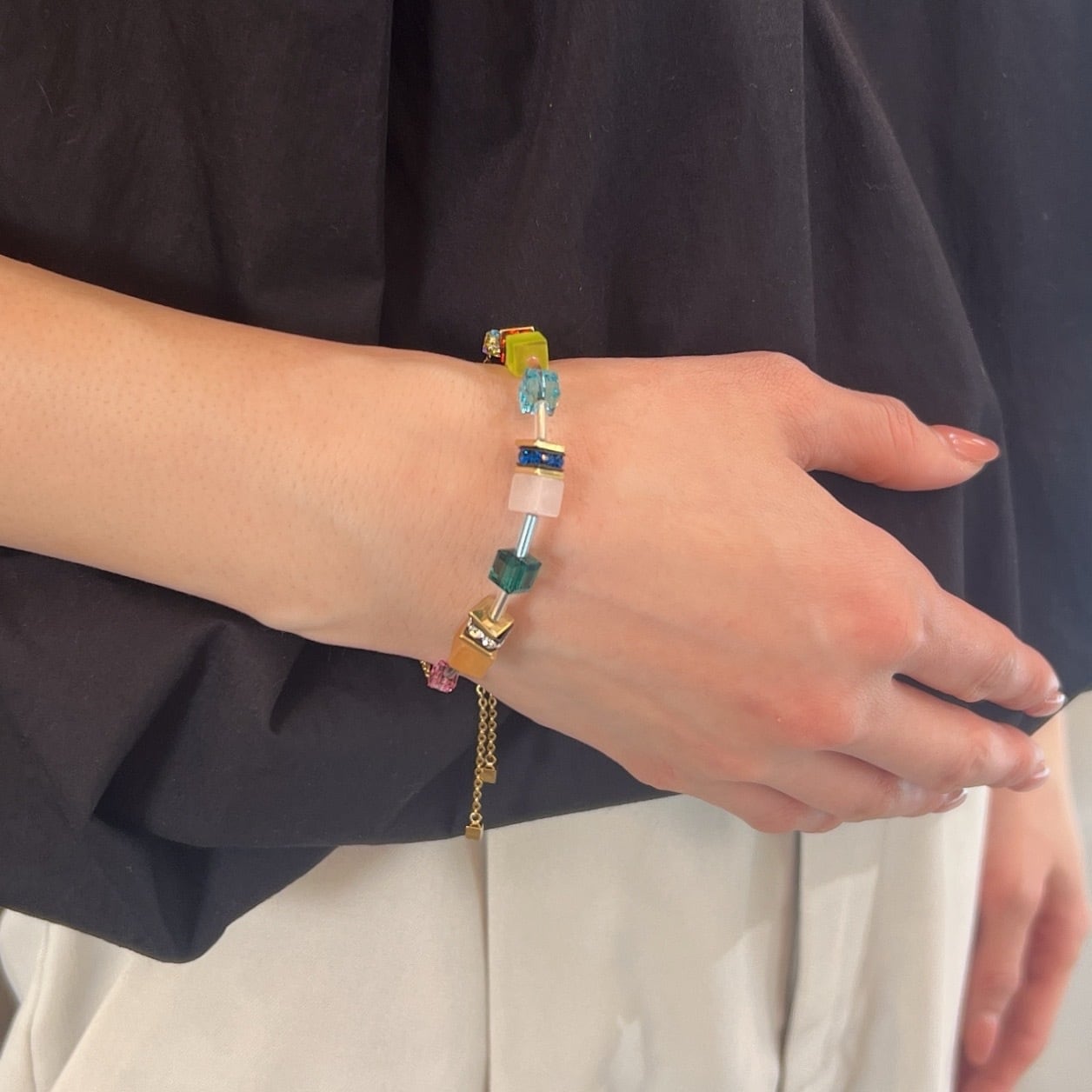 色鮮やかなSwarovski®クリスタルやラインストーン、上品で華やかな天然石を使用したブレスレット。ゴールドカラーのステンレススチール製スライドパーツで長さは簡単に調節可能。さまざまなスタイルに合わせてお楽しみいただけます。