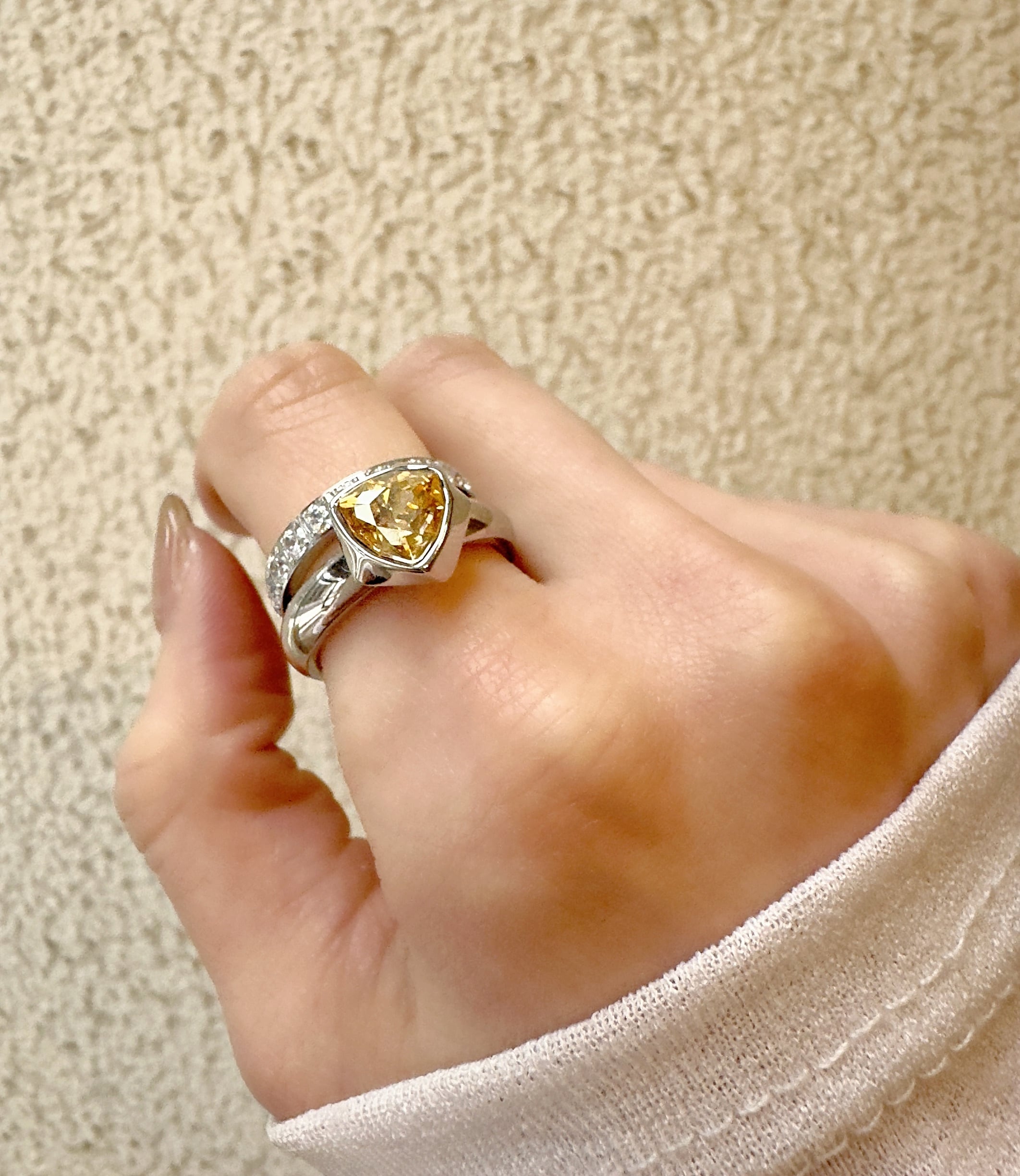 幾何学的でありながら柔らかさも感じさせるデザインは、指先にモダンなアクセントを添えます。
